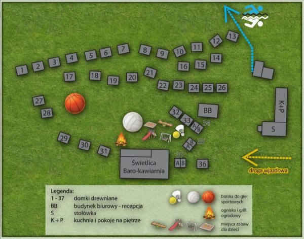 miejsce na ognisko i grill oraz plac zabaw dla najmłodszych i boisko sportowe.